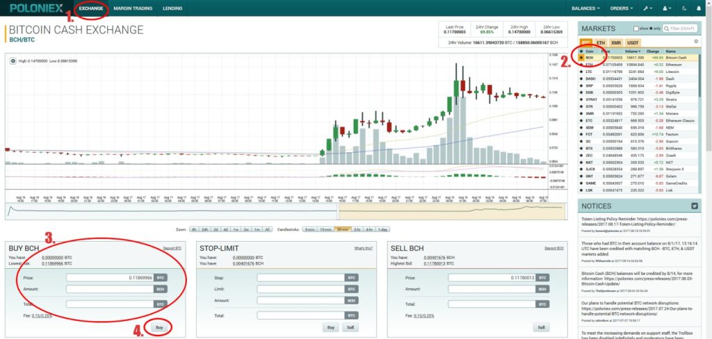 Для этого нужно в левой колонке выбрать ту валюту, которую вы хотите использовать для обмена (в случае перевода средств с электронного кошелька можно выбрать, к примеру, WMR — рубли вебмани, а при переводе средств с личной карты — Сбербанк и т. д.) В правой колонке выбираем интересующую нас криптовалюту. Так как Биткоин Кеш нельзя купить напрямую, необходимо купить более популярные криптовалюты, например, Биткоин или Эфириум. После приобретение популярной криптовалюты нужно перевести ее на свой кошелек криптовалютной биржи, в которой вы создали аккаунт. Далее очень просто можно обменять те же Биткоины на Биткоин Кеш с помощью инструментов биржи.